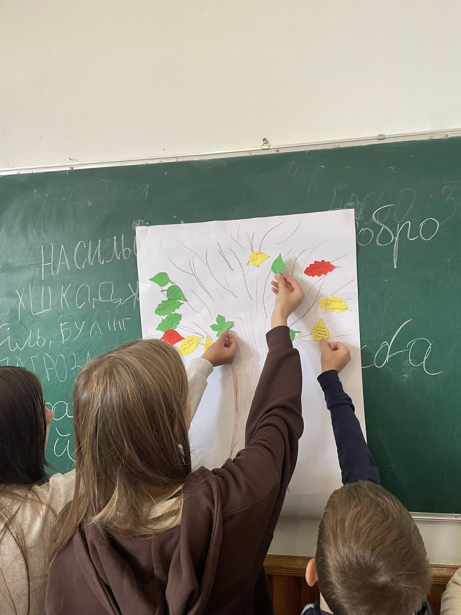 Учні мали можливість поговорити про те, що таке насильство, у яких формах воно проявляється, як захистити себе та допомогти іншим. У ході інтерактивних вправ школярі висловлювали власні думки, створювали «Дерево добрих вчинків» і дійшли висновку, що найкраща зброя проти насильства – повага, дружба та взаєморозуміння. ![]()